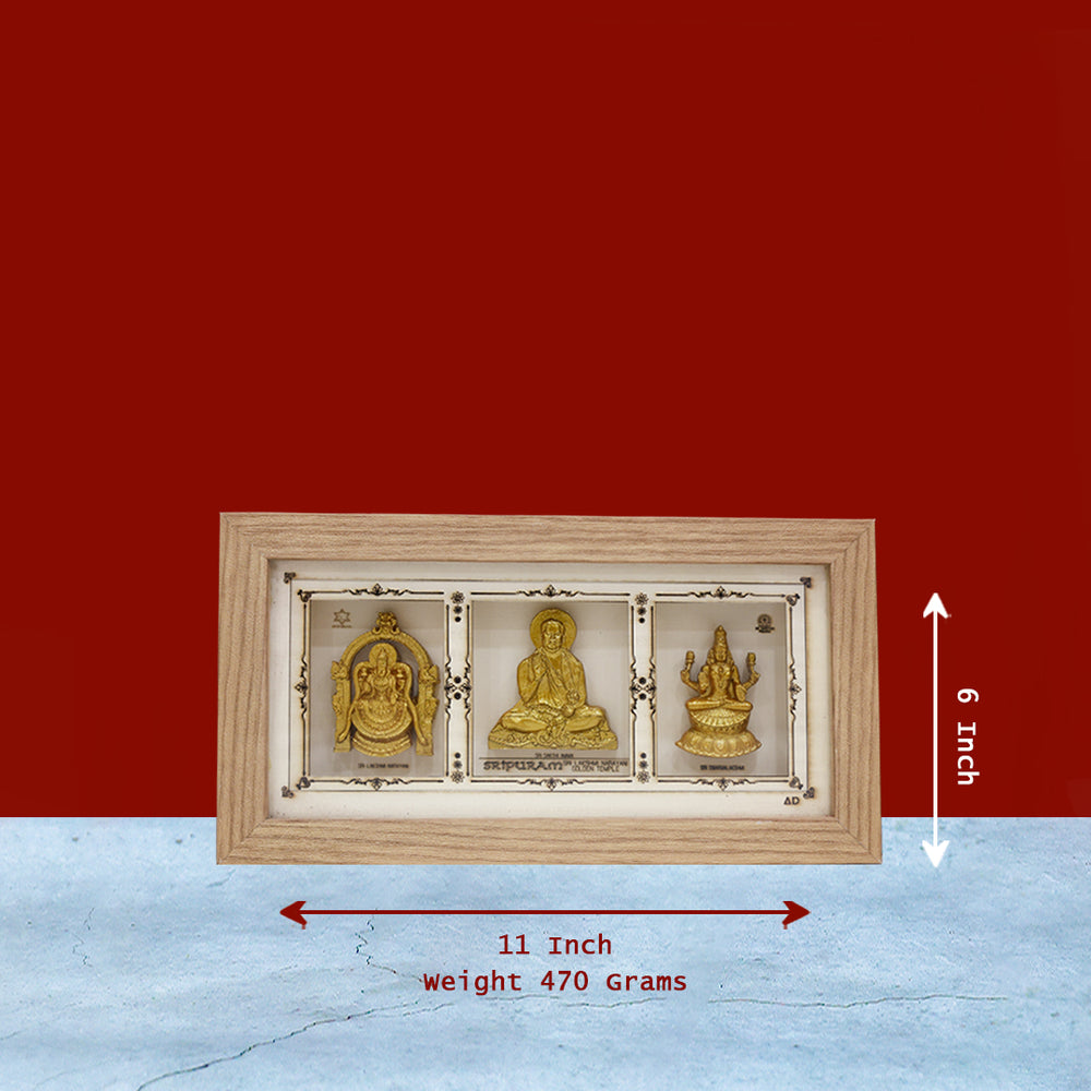 Triple Deity Wooden Frame – Lakshmi Narayani | Sakthi Amma | Swarna Lakshmi – 11" x 6"